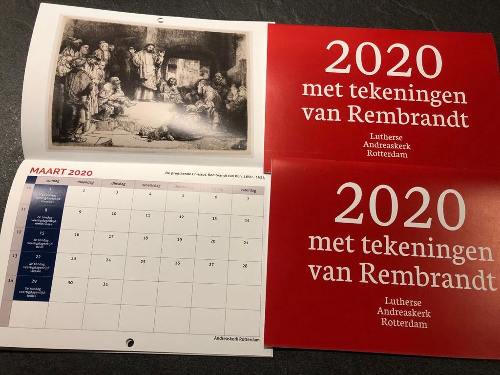 Afgelopen jaar was het Rembrandtjaar. Daarom stonden tijdens de diensten rondom Advent, Kerst en Driekoningen prenten en schilderijen van Rembrandt afgedrukt op de liturgieboekjes. Met de kalender aan uw wand kunt u ook in 2020 de prachtige tekeningen van Rembrandt bewonderen.